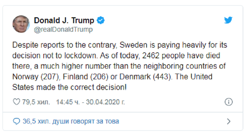 Преди ден остро мнение срещу мерките в Швеция изрази и президентът на САЩ Доналд Тръмп, като поводът бе съобщение на Световната здравна организация. В него шефът на организацията обяви, че страните по света постепенно в следващите месеци ще преминават към модела на Швеция, но изричното уточнение бе, че сега е още рано за това.