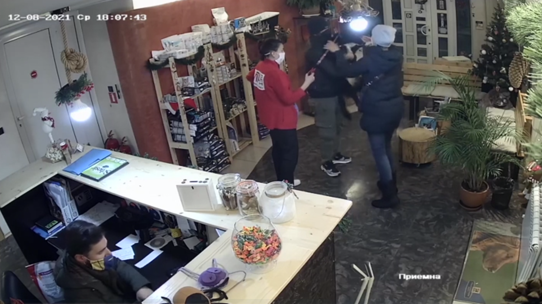 Цялата ситуация обаче е заснета от камерите за видео наблюдение. Първоначално, клиентите пристигат и започват да се радват на домашния си любимец, информира БНТ.