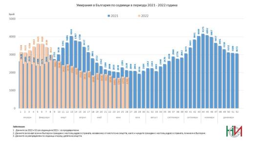 В таблицата на седмичната смъртност, публикувана от института, се вижда траен спад в броя на умиранията от март насам.