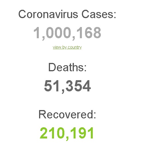 Заразените от коронавирус в световен мащаб минаха 1 милион души, сочи статистиката към този час на Worldometer, видя ПИК. Починалите са 51354.
