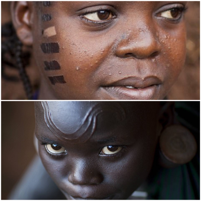 Младите момичета се режат с ножове и ножчета за бръснене, за да създадат релефни белези. Те са убедени, че така ще са сред най-красивите в племенните общества в Етиопия.