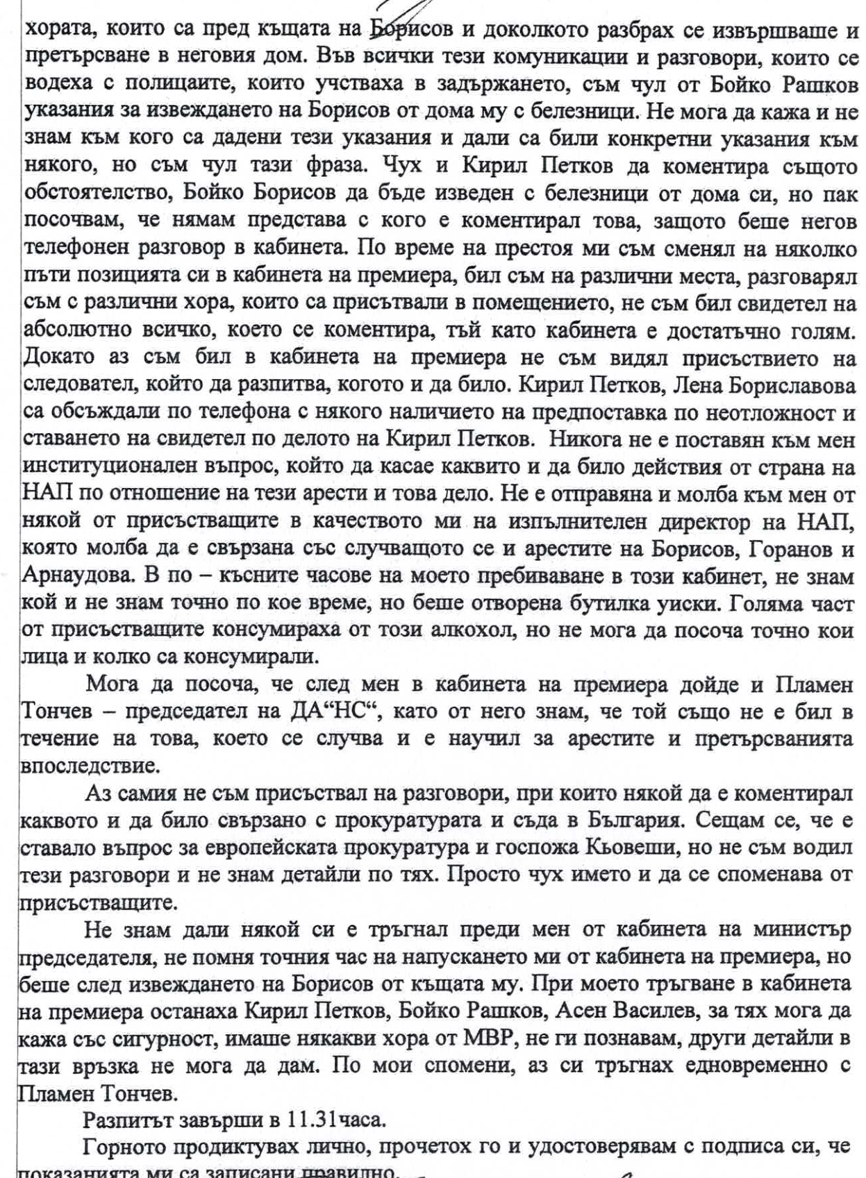 Всички седнаха на масата, дамите пиеха шампанско, а мъжете пиеха уиски. Говореше се от Кирил Петков и най-вече Асен Василев, че Бойко Борисов трябва да бъде изведен с белезници от къщата и така да го закарат в ГДНП…Сещам се, че в някакъв момент Асен Василев обясняваше, че трябвало да се обади, че Борисов се арестува във връзка с европрокурорката Кьовеши, после започнаха да съжаляват, че са обявили, че ареста на Борисов е във връзка с Кьовеши…мисля Асен Василев каза на този шеф на ПР в МВР, че задължително Бойко Борисов трябва да е с поставени белезници на ръцете, звъняха на някой в ГДНП, някъде около 22.30-23.00 часа аз си тръгнах от МС…“