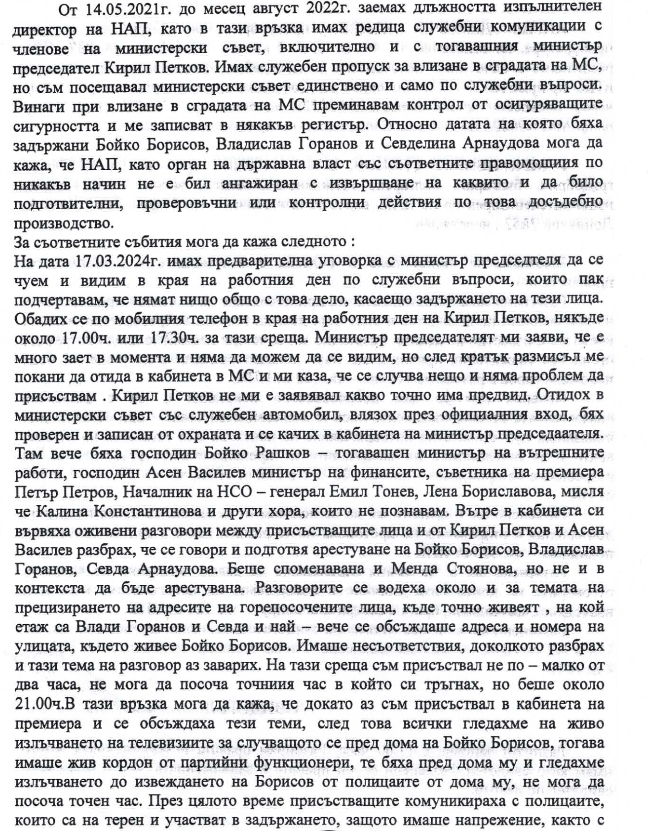 „Всички гледахме на живо излъчването на телевизиите за случващото се пред дома на Бойко Борисов, тогава имаше жив кордон от партийни функционери, те бяха пред дома му и гледахме излъчването до извеждането на Борисов от полицаите от дома му…през цялото време присъстващите (в кабинета на К.Петков) комуникираха с полицаите, които са на терен и участват в задържането…Във всички тези комуникации и разговори, които се водеха с полицаите, съм чул от Бойко Рашков указания за извеждането на Борисов от дома му с белезници. Чух и Кирил Петков да коментира същото обстоятелство, Бойко Борисов да бъде изведен с белезници от дома си…