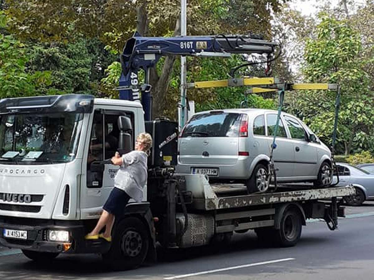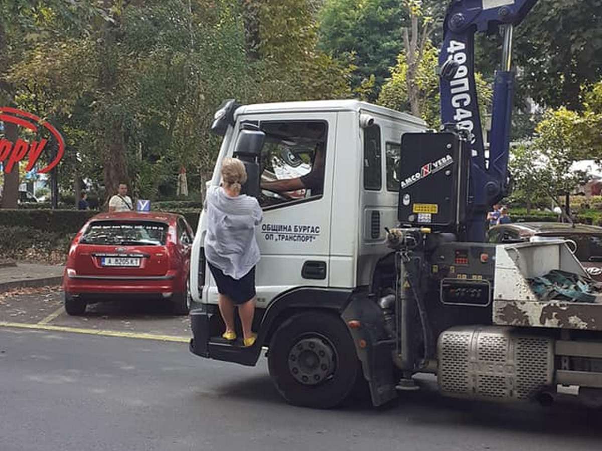 "Гражданката беше спряла неправилно, но се върна докато паяка вдигаше колата й. Беше готова да си плати глобата, за да не я репатрират, но и беше отказано. Тогава тя застана пред паяка, но шофьорът тръгна назад и се опита да продължи към наказателния паркинг. В този момент русата дама се качи на стъпалото на кабината и се хвана за огледалото. Шофьорът не се впечатли и продължи към наказателния паркинг", разказва очевидец.
