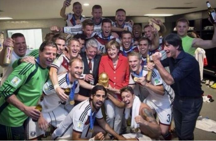 Канцлерът на Германия Ангела Меркел присъства на купона в съблекалнята на Бундестима след вчерашната победа с 1:0 над Аржентина и спечелената световна титла.