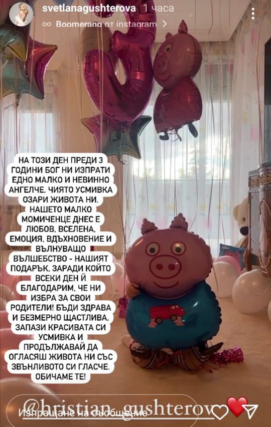 "На този ден преди 3 години Бог ни изпрати едно малко и невинно ангелче, чиято усмивка озари живота ни. Нашето малко момиченце днес е любов, вселена, емоция, вдъхновение и вълнуващо вълшебство - нашият подарък, заради който всеки ден й благодарим, че ни избра за свои родители! Бъди здрава и безмерно щастлива, запази красивата си усмивка и продължавай да огласяш живота ни със звънливото си гласче. Обичаме те!", пък написа Гущерова в профила си в Инстаграм.