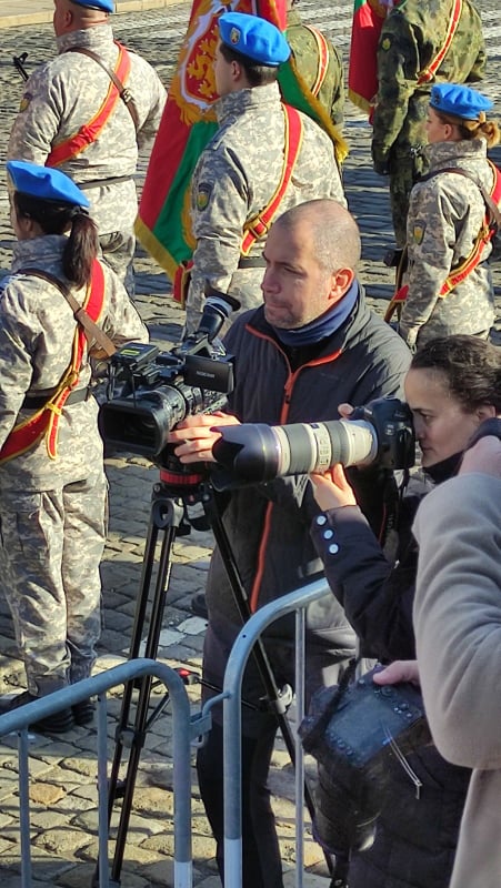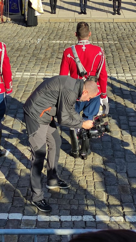 Сал колегата им, натоварен с отговорната задача да снима държавния глава и след това да монтира кратко клипче за страницата му във Фейсбук, получи правото да се вре из гвардейците, докато търси най-добрия ракурс към своя началник Радев.