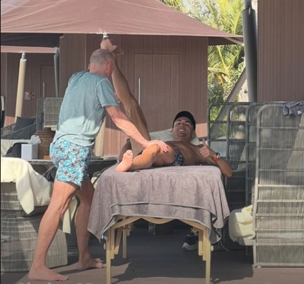 Звездата бе щракнат в масажно студио на открито, докато масажистът разтяга краката му.