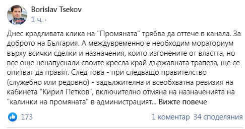 "Днес крадливата клика на "Промяната" трябва да оттече в канала." Това написа в профила си във "Фейсбук юристът Борислав Цеков. Той призова, че трябва да започне възстановяване на държавността и конституционния ред.