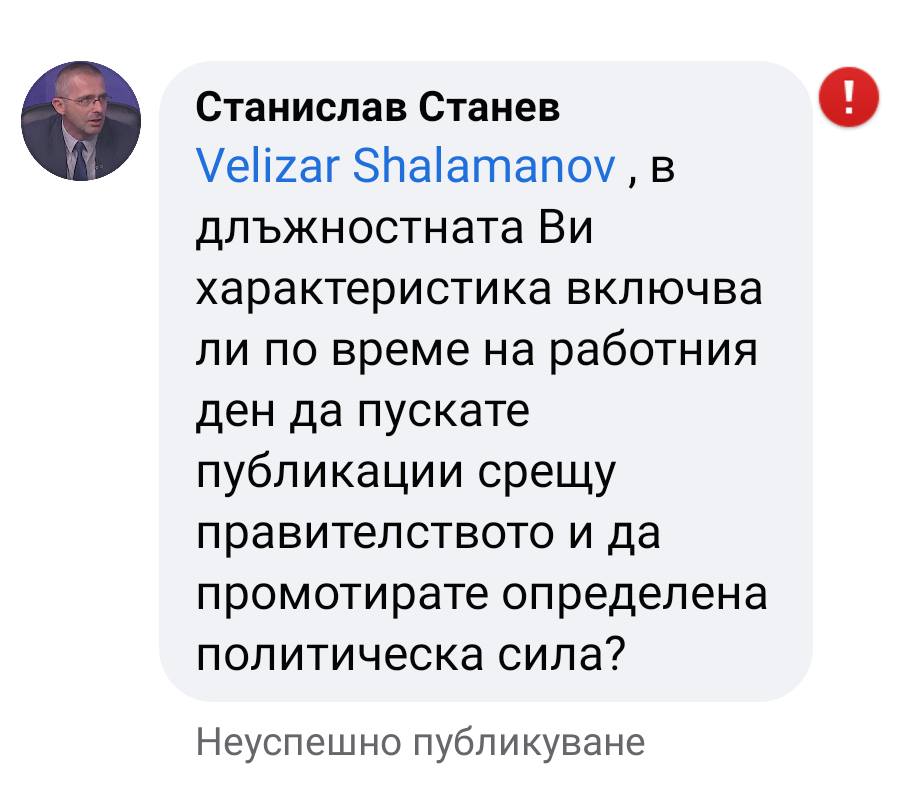 Само че избранникът вместо да запретне ръкави и да докаже, че е способен и заслужава полученото довереие, реши да инвестира времето си в нещо друго. Както посочих и по-горе, огромната част от обилната му активност във Фейсбук беше насочена срещу правителството. Да, точно така, в работно време, когато би следвало да изпълнява служебните си задължения, за което му се плаща прилична заплата (и от нашите данъци), той го играеше партиен агитатор. Признавам си честно, че не съм чел длъжностната характеристика и не знам какво се очаква от него в замяна на трудовото му възнаграждение. Във всеки случай силно се съмнявам задълженията му да включват партийна агитация и криптоагресия срещу правителството", разкрива още Станев.