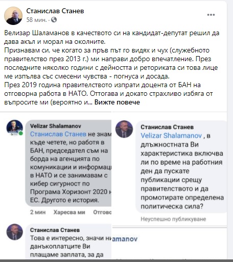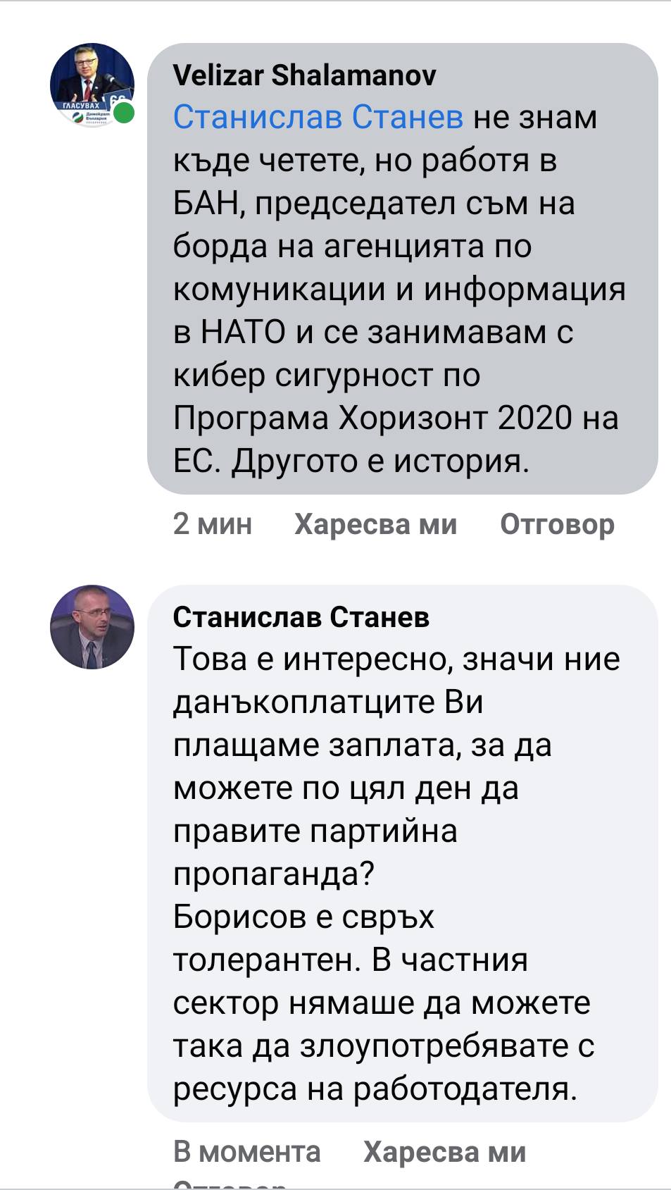 "През 2019 година правителството изпрати доцента от БАН на отговорна работа в НАТО. Оттогава и докато страхливо избяга от въпросите ми (вероятно и все още) Велизар Шаламанов уплътняваше работната част от денонощието си да пише публикации против правителството и управляващата партия. Разбирам, че всеки има право на мнение и несъгласие с управлявващите. Тук се оказва, че управляващите не са сложили някоя калинка на хубав пост, а са проявили добронамереност, като са предпочели кадър на една от най-агресивните към тях партии.