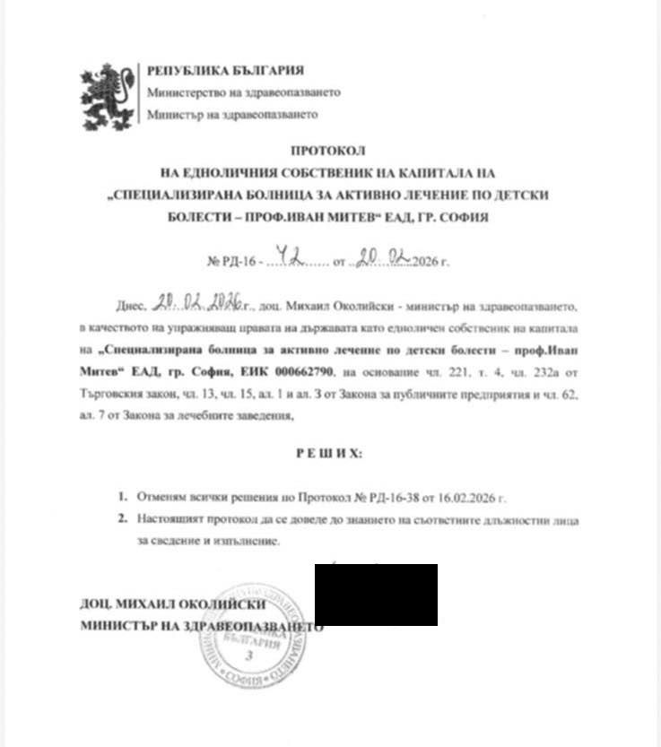 "Първата работа на министъра на здравеопазването още в петък беше да отмени решението на министър Кирилов за назначаването на новия директор на детската болница "Проф. Иван Митев".