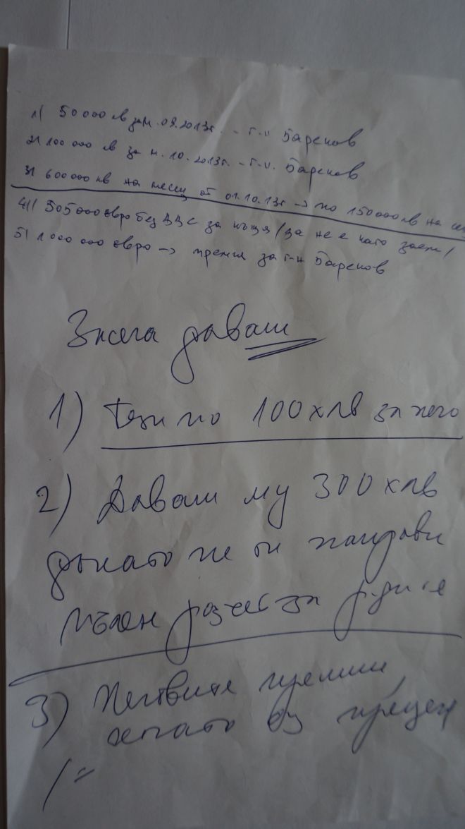 Според подателя в горната част на документа, който виждате, финансисът на ББЦ е посочил исканите от партията суми за подпомагане на дейността на лидера й Николай Бареков (точки 1-5). Те варират от 50 хиляди лева до 600 хиляди лева и се отнасят за месеците след август 2013 г. Включени са сума от 505 хиляди евро за къща и премия за Николай Бареков в размер на 1 млн. евро.