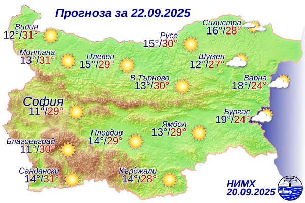 От нощта е ясно и почти тихо. Преобладаващите минимални температури са между 10° и 15°, в София - около 11°. През деня ще бъде слънчево, но преди обяд над Източна България ще има ниска облачност. Ще духа слаб до умерен източен вятър. Максималните температури ще бъдат между 26° и 31°, в София - около 28°.
