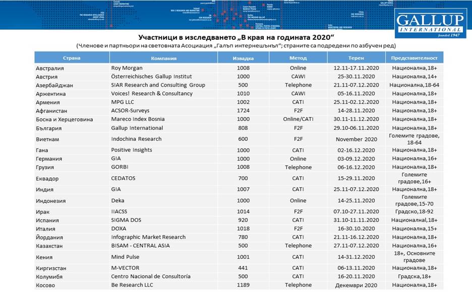 Това са някои от акцентите на новото глобално изследване на отношението към коронакризата, проведено от Асоциация „Галъп интернешънъл“ в края на 2020 г. Проучването обхваща 47 държави по света и около 45 000 пълнолетни граждани, което е представително за около две трети от глобалното население. През цялата 2020 г. Асоциация „Галъп интернешънъл“ проследи развитието на глобалните нагласи на населението към пандемията. Резултатите, представени по-долу, идват от четвъртата вълна на глобалното проследяване.