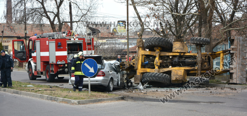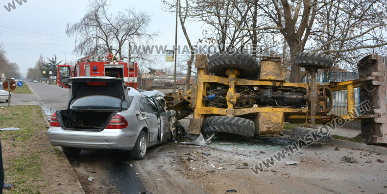 При сблъсъка тежката машина се преобърнала. Пострадали са двамата водачи. По-сериозно пострадал шофьорът на колата.